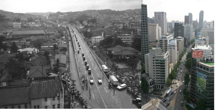 ▲1966년대(왼쪽)와 2007년대 서소문로 전경. 사진=서울기록원·서울시 제공 |