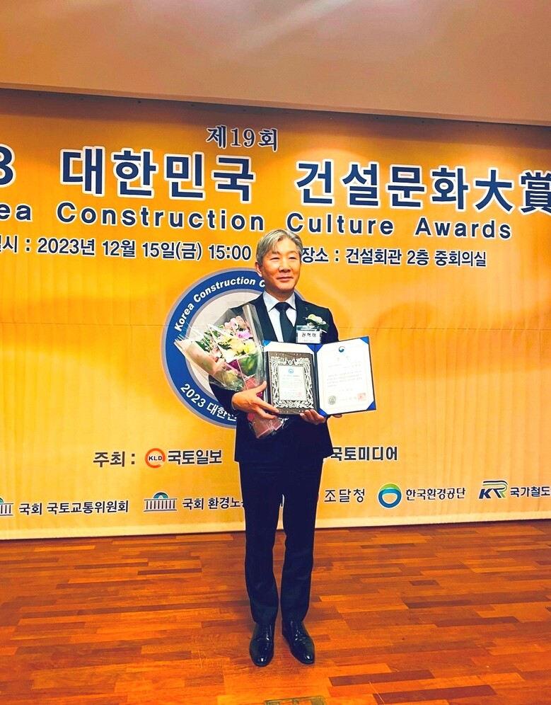 ▲신명마루 권혁태대표이사가 건설회관에서 국토교통부장관상을 수상하는 모습 사진<사진제공=신명마루> |