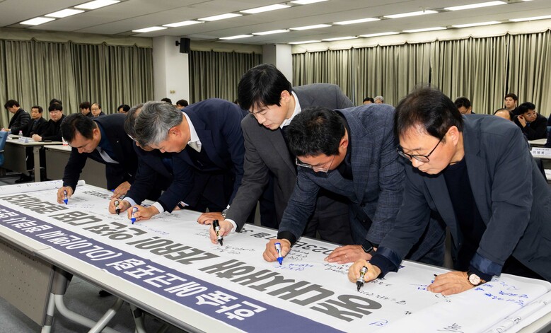 ▲DL이앤씨 협력사 협의체인 한숲에코포럼이 주최한 안전결의대회에서 협력사 대표들이 안전 메시지를 작성하고 있다.<사진제공=DL이앤씨> |