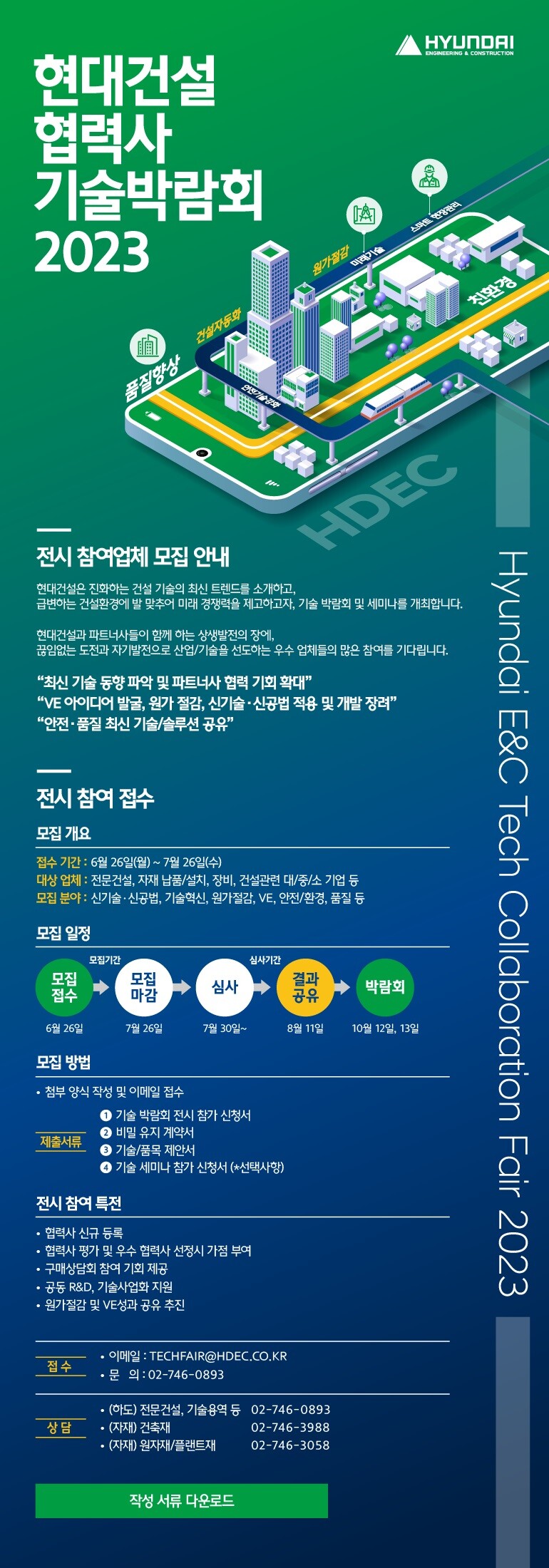 현대건설 홈페이지(www.hdec.kr)를 통해 7월 26일까지 ‘기술 박람회 전시 참가 신청서’를 포함한 관련 서류를 제출하면 된다.