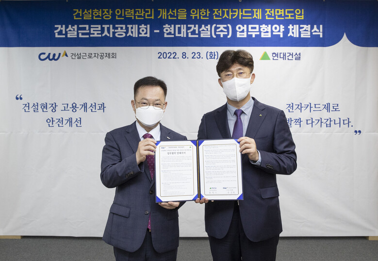 현대건설과 건설근로공제회는 지난 23일, ‘건설근로자 편의와 현장 인력관리 개선을 위한 건설근로자 전자카드제 전면 도입 업무협약(MOU)’을 체결했다.