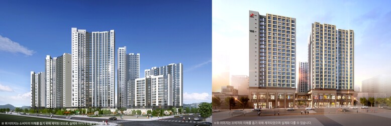 ▲(좌) 100% 계약을 마친 ‘리버센 SK뷰 롯데캐슬’ 투시도(우), 24일부터 계약을 앞둔 ‘강동역 SK리더스뷰’ 오피스텔 투시도<자료제공=SK에코플렌트> |