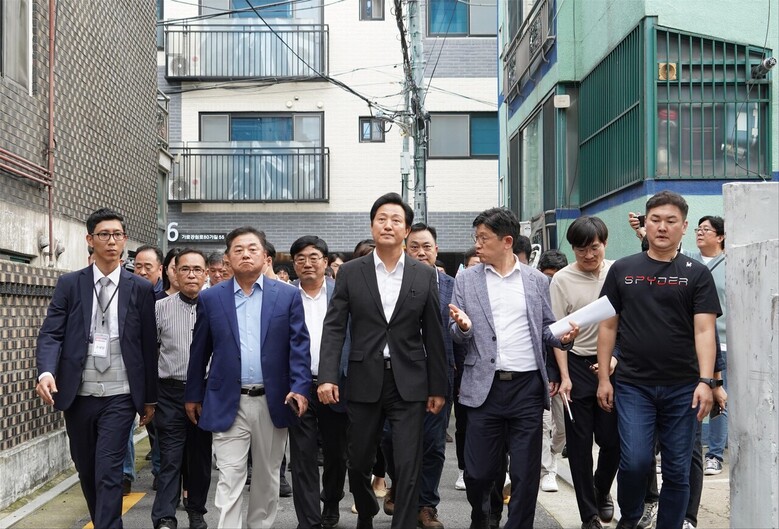 ▲오세훈 서울시장(가운데)이 4일 강서구 화곡동 모아타운 추진 현장을 방문해 점검하는 모습. 사진=서울시 제공 |