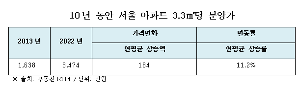 부동산 빅데이터 부동산R114의 분양 데이터에 따르면 지난해 서울 아파트의 3.3㎡당 평균 분양가는 3,474만원으로 10년전인 2013년(1,638만원) 대비 112.1%(약 2.1배) 상승했다.