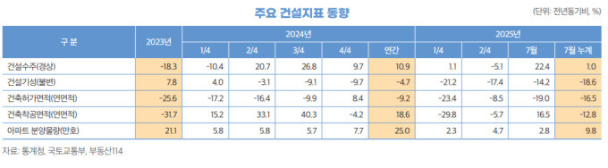 대한건설정책연구원(건정연)이 30일 발표한 보고서에 따르면, 7월까지 집계된 건설 수주는 전년 동기 대비 1.0% 증가했지만 경상금액 기준이라 실질적으로는 감소세에 가깝다는 분석이다. 같은 기간 건축허가면적과 착공면적은 각각 16.5%, 12.8% 줄었다.