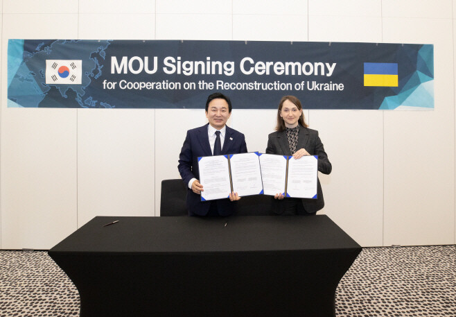 ▲원희룡 국토교통부 장관(왼쪽)과 올렉산드르 아자르키나 우크라이나 공동체영토인프라개발부 차관이 우크라이나 재건 위한 협력강화 업무협약을 체결하고 기념촬영을 하는 모습. 사진=국토부 제공 |