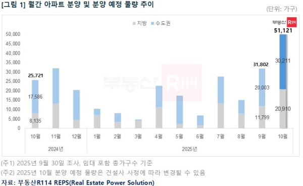 1일 부동산R114 집계에 따르면 10월 전국 분양 예정 아파트는 총 57개 단지, 5만1121가구(임대 포함)로 나타났다. 이는 올해 상반기 월평균 분양 물량(1만1725가구)의 약 5배 규모로, 계획대로 소화될 경우 2021년 12월(5만9477가구) 이후 3년 10개월 만에 최대 물량이다.