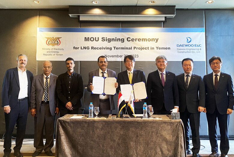 대우건설은 이집트 카이로에서 지난 22일(현지기준) 압둘하킴 파드헬 모함메드 (Abdulhakim Fadhel Mohammed) 예멘 전력에너지부 제1차관 등 주요 관계자를 만나 예멘이 최우선 사업으로 추진하고 있는 LNG 인수기지 프로젝트 추진을 위한 양해각서(MOU)를 체결했다고 밝혔다. 이 날 체결된 MOU는 Little Aden 지역 발전소의 가스 공급을 위한 LNG 인수기지 및 연결 파이프라인을 건설하는 사업으로 대우건설과 예멘 전력에너지부는 추후 450MW 규모의 복합화력 발전소 신설 등 추가 에너지 인프라 사업도 협업하기로 논의했다.