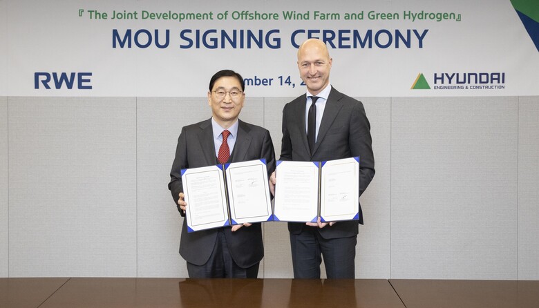 현대건설은 지난 14일 서울 종로구 계동에 위치한 현대건설 본사에서 알더블유이 오프쇼어 윈드(RWE Offshore Wind GmbH, 이하 RWE)와 ‘해상풍력발전 및 그린수소사업 공동개발’에 대한 전략적 업무협약(MOU)을 체결했다. 이날 서명식은 현대건설 윤영준 사장, RWE 스벤 우테르묄렌(Sven Utermöhlen) CEO 등 양사의 주요 경영진이 참석한 가운데 이뤄졌다.