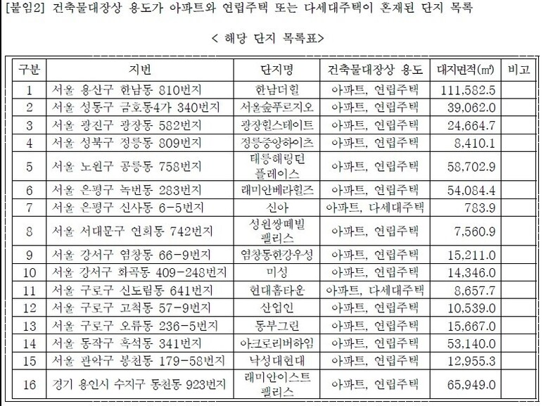 이번 지정은 아파트 단지 내 연립·다세대 주택을 허가구역에 포함한 것이 핵심이다. 서울 15곳, 경기 1곳 등 총 16개 단지의 739가구가 허가 대상으로 추가됐다.